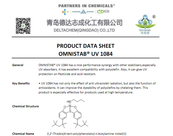 OMNISTAB UV 1084着色性小对聚烯烃染料有螯合作用,可改善染色性,毒性低,对皮肤刺激性小,对常在高温下使用或长期经受日晒的制品尤为适宜。也可以与其他形式的稳定剂很好的配合使用尤其是紫外线吸收剂类产品。与聚烯烃产品具有极强的兼容性。使用在聚乙烯农用薄膜和聚丙烯人造草坪上具有极高的稳定性。