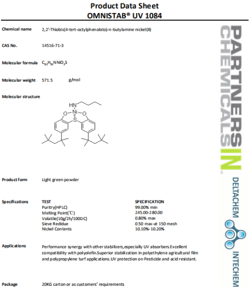 OMNISTAB UV1084 is also known as 2,2-thiophenol (4-tert-octyl phenol) n-butylamine nickel salt or (1-butyl amine) [[2,2-(sulfur-KS)2[4-(methyl butyl,1,3,3, 1-4) phenol root close - KO]] (2 -)] nickel.