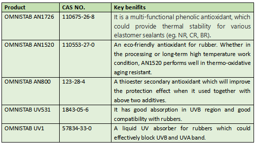 We are committed to providing a variety of additives formula for rubber sealant materials. The thermo-stability, aging resistance and UV light resistance of rubber sealant could be further improved by adding OMNISTAB additives. Thus the sealant obtain an long service life as well as maintaining high elasticity.