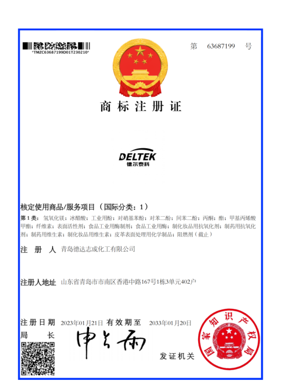 Recently, the "DELTEK" trademark of Deltachem(Qingdao) Co., Ltd was registered successfully.