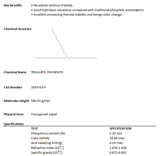 There are many types of phosphite, including diaryl esters, dialkyl esters, di (alkylated aryl) esters, alkyl-aryl mixed esters and so on. The main phosphite commonly used in PVC are as follows: triphenyl phosphite (TPP), diisodecyl phosphite (PDDP), trnonyl phenyl phosphite (TNPP), bisphenol A phosphite (1500) and so on.