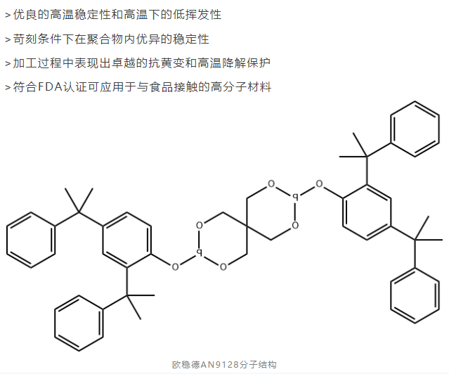 Suitable for PC, PA, and other engineering plastics that require high-temperature processing. Unlike most phosphite ester products, which decompose or volatilize and are unsuitable for use as processing stabilizers, Omnistab® AN9128 maintains color and torque stability.