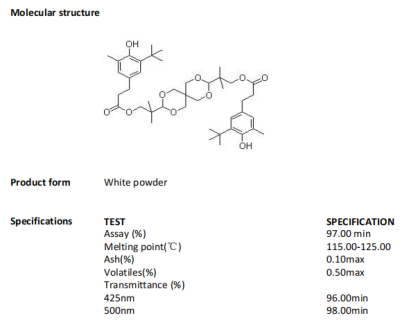 Of course as a kind of high molecular weight hindered phenolic antioxidant, OMNISTAB AO80 also has the performance of low volatile and excellent gas fading resistance. Synergistic effects will be produced when it is combined with phosphite antioxidant and sulfur antioxidants, which has better thermal aging resistance. OMNISTAB AO80 is suitable for most plastics, polyolefin and various elastomers, especially for PA,PUR,PE,POM,PP.